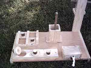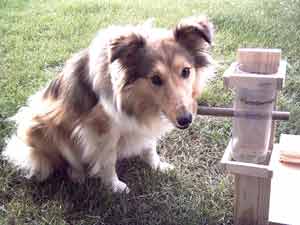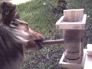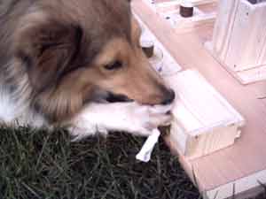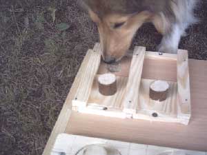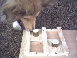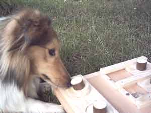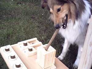 Dieser Leckerliautomat ist selbst gebaut. Die einzelnen Einheiten müssen unterschiedlich gelöst werden. Einmal durch schieben, einmal durch wegnehmen, dann Schublade öffnen durch Ziehen an dem Band, Stöckchen herausnehmen, um ans am Boden liegende Leckerli zu kommen und schließlich durch Herausnehmen eines Stabes (sieht man hier nicht). Weiteren Varianten sind keine Grenzen gesetzt.  |